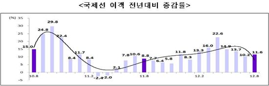 [아시아경제 조태진 기자]국제선 이용객이 두 달 연속 최고치를 경신했다. 휴가철을 이용해 해외 여행에 나선 국내 이용객에 중국·일본 관광객 수요가 더해진 결과다.20일 국토해양부에 따르면 지난 8월 국제 항공여객 이용자 수는 472만명으로 종전 최고치인 7월의 434만명을 넘어섰다. 이는 전년 동기보다 11.6% 늘어난 수치다.노선별로는 일본이 지난해 같은 기간 보다 16.6% 늘었고, 중국과 동남아도 각각 12.3%와 11.5%로 상당폭 증가했다. 국토부는 지난달 13~16일 일본 오봉연휴 기간을 이용해 국내에 들어온 여행객이 상대적으로 많았던 것으로 분석했다.이런 가운데 국내선 여객은 잇따른 태풍 영향으로 전년 동기 201만 명보다 5.3% 감소한 191만명이었고, 국내ㆍ국제 항공화물은 29.3만t으로 전년보다 1.0% 감소했다.국토부 관계자는 "성수기 효과와 함께 저비용항공사의 운항 횟수가 늘어나면서 관광 수요가 늘어난 것"이라며 "이번달은 추석연휴기간을 이용한 해외여행 수요와 한류 효과로 증가세를 지속할 것으로 전망된다"고 말했다.조태진 기자 tjjo@<ⓒ세계를 보는 창 경제를 보는 눈, 아시아경제(www.asiae.co.kr) 무단전재 배포금지>