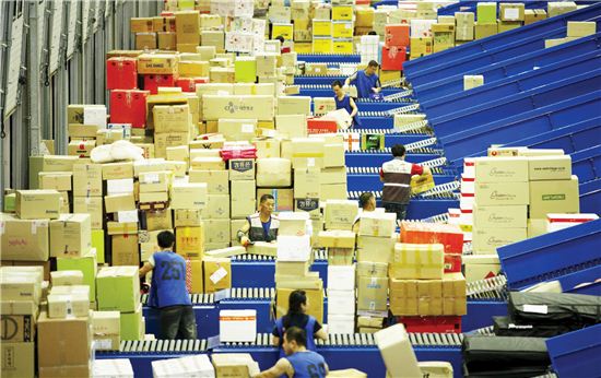 대전 문평동 CJ대한통운 허브터미널에서 직원들이 바쁘게 분류작업을 하고 있다.