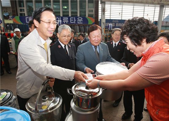 [아시아경제 김은별 기자] KB국민은행은 24일 추석을 앞두고 충남 천안시에 위치한 남산중앙시장에서 '전통시장 사랑나눔' 행사를 실시했다. 이번 행사는 저소득가정에 전달할 생필품을 전통시장에서 구입하는 행사로, 지난해 연말에 이어 24일을 전후로 남산중앙시장 외 전국 33곳의 전통시장에서 실시된다. 국민은행은 전통시장에서 구매한 생필품 등을 소외계층 7900명에게 지원할 예정이며, 전국 33개 지역본부별로 전통시장과 사회복지시설 1개씩을 선정한 후 복지시설에서 필요한 급식재료 등을 전통시장에서 직접 구매할 수 있도록 전통시장 상품권을 지원한다. 국민은행 관계자는 "전통시장의 활성화에 기여하면서 동시에 어려운 이웃도 돕게 돼 더욱 의미가 있다"며 "이러한 형태의 사회공헌 활동을 지속적으로 실시해 어려운 이웃들에게 도움이 될 수 있도록 하겠다"고 말했다. 김은별 기자 silverstar@<ⓒ세계를 보는 창 경제를 보는 눈, 아시아경제(www.asiae.co.kr) 무단전재 배포금지>