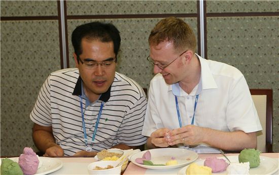 니콜라스 폴스 삼성디스플레이 책임연구원(우측, 미국)과 조연제 책임연구원이 함께 형형색색 송편을 빚고 있다.<br />