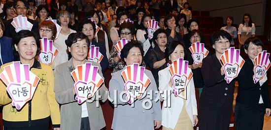 [아시아경제 정재훈 기자] 김금래 여성가족부 장관이 25일 오후 서울 종로구 이화여고 100주년 기념관에서 '성폭력 근절 결의대회-아동·여성폭력 없는 행복세상'에 참석해 여성 단체 관계자들과 행복세상을 다짐하는 피켓을 들고 있다.정재훈 사진 roze@<ⓒ세계를 보는 창 경제를 보는 눈, 아시아경제(www.asiae.co.kr) 무단전재 배포금지>