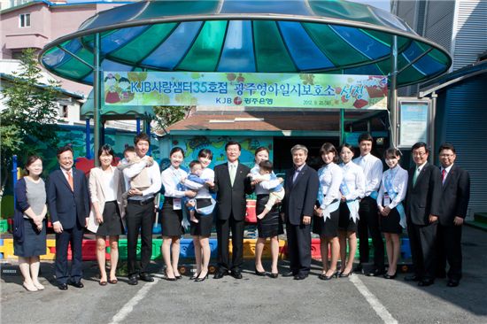 ▲25일 송기진 광주은행 은행장과 KJB대학생 홍보대사들은 광주영아일시보호소를 찾아 'KJB사랑샘터 35호점' 선정식을 갖고 봉사활동을 펼쳤다. 이날 행사에 참여한 송 행장(사진 가운데)이 KJB대학생 홍보대사들과 함께 기념촬영을 하고 있다.(출처: 광주은행)