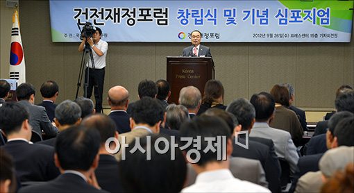 [아시아경제 윤동주 기자] 26일 서울 중구 프레스센터에서 열린 '건전재정포럼' 창립발기인모임에 참석한 박재완 기획재정부 장관이 축사를 하고 있다.윤동주 기자 doso7@<ⓒ세계를 보는 창 경제를 보는 눈, 아시아경제(www.asiae.co.kr) 무단전재 배포금지>