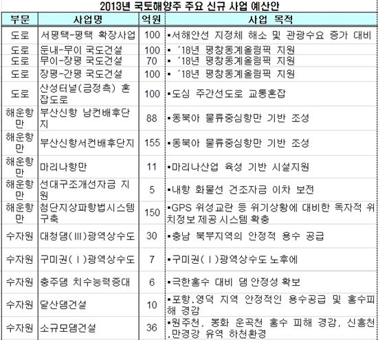 내년 국토해양부 신규 주요 사업 살펴보니[아시아경제 박미주 기자]서해안고속도로의 상습정체구간인 서평택~평택구간 확장공사가 내년 착수된다. 평창동계올림픽 개최를 위해 국도 6호선 둔내~간평(52.5㎞)간 구간 신설공사도 새로 시작된다.가장 많은 예산이 투입되는 신규사업은 동북아 물류중심항만 기반 조성을 위한 서쪽 컨테이너 배후단지로 155억원의 예산이 배정됐다.27일 국토해양부는 2013년 예산안을 전년에 비해 4.2% 늘린 23조4000억원으로 편성했다며 이 같이 밝혔다. 내년 국토해양부 주요 신규사업에는 총 1153억5000만원이 투입된다. 분야별로 도로 470억원, 해운항만 409억원, 수자원 89억원, 해양환경 50억원, 물류 등 기타 84억원, 지역 및 도시 51억5000만원 등이다.먼저 가장 예산투입이 많은 도로분야에는 상습 정체구간 해소를 위한 서해안고속도로 서평택~평택구간 확장, 평창동계올림픽 개최 지원을 위한 국도 6호선 둔내~무이(22.5㎞), 무이~장평(5.5㎞), 장평~간평(24.5㎞) 구간 등 12개 도로사업이 신규로 착공된다.해운항만에서는 부산항의 허브경쟁력 제고를 위해 남·서측 배후단지 개발(243억원)에 착수한다. 선박통항안전을 위한 첨단지상파항법시스템 구축(105억원)도 신규 추진한다. 해양관광활성화 지원을 위한 마리나 항만개발(11억원)과 재정여건이 열악한 연안화물운송사업자의 선박교체지원을 위한 선박건조자금(5억원)도 내년부터 지원된다.수자원과 산업단지의 경우 안정적 용수공급과 홍수예방 등을 위해 충주댐치수능력증대사업(6억원), 달산댐(10억원), 대청댐Ⅲ(30억원)·구미권Ⅰ(7억원) 광역상수도 건설이 추진된다. 산업단지 활성화를 위한 20개 진입도로 사업(270억원)도 착수할 계획이다.교통과 물류분야에서는 이용편의를 위한 택시 전국통합콜센터 설치(20억원)와 지자체의 장애인 콜택시 도입(50억원)을 정부가 신규로 지원한다. 또 물류비 절감과 교통량 감소를 위해 도심·사각지대 공동물류 시범사업(10억원)도 지원할 방침이다.국토·도시에서는 해안권발전 선도사업 신규 추진(26억원)을 통해 지역 간 연계발전을 도모한다. 저류기능을 갖춘 도시공원 조성(2억원)을 통해 도심부 재해대응능력도제고한다.해양환경·녹색을 위해서는 해안가쓰레기 수거처리을 신규 지원(50억원)하고 녹색 건축물 전환을 위한 그린리모델링 활성화 사업(24억원)을 추진할 예정이다.국토부 관계자는 "내년 예산투자가 국가의 지속가능 성장기반을 마련하는 미래대비 투자가 될 수 있도록 할 것"이라며 "편성된 예산은 최대한 조기 집행해 지역고용을 창출하고 건설경기 연착륙을 도모해 불확실한 경제전망에 대응할 계획"이라고 말했다.