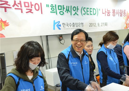 김용환 한국 수출입은행장은 27일 서울역 인근에 있는 무료급식소 따스한 채움터를 찾아 무료배식 봉사활동을 펼쳤다.<br />