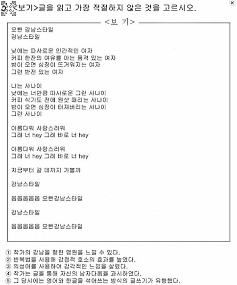 [아시아경제 온라인이슈팀] '500년 후 국어 시험지'라는 게시물이 네티즌들 사이에 화제다.최근 다수의 온라인 커뮤니티 게시판에는 '500년 후 국어 시험지'라는 제목으로 관련 사진이 담긴 게시물이 올라왔다.이 게시물은 500년 후 국어시험지를 가상으로 만들어 본 것으로, 싸이 '강남스타일'을 지문으로 활용해 '글을 읽고 가장 적절하지 않은 것을 고르시오'라고 지시하고 있다.이어 보기로 '작가의 강남을 향한 열정을 느낄 수 있다', '반복법을 사용해 감정적 호소의 효과를 높였다', '의성어를 사용하여 감각적인 느낌을 살렸다', '작가는 글을 통해 자신의 남자다움을 과시하였다', '그 당시에는 영어와 한글을 섞어 쓰는 방식의 글쓰기가 유행했다' 등이 제시됐다.마치 고전문학 시험지를 연상케 하는 '500년 후 국어 시험지' 사진을 본 네티즌들은 "실제로 생길 것 같다", "역사에 남을 싸이", "재밌게 만들었네요" 등의 반응을 보이고 있다.온라인이슈팀 <ⓒ세계를 보는 창 경제를 보는 눈, 아시아경제(www.asiae.co.kr) 무단전재 배포금지>