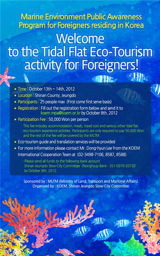 [아시아경제 박미주 기자]해양환경관리공단(KOEM)이 오는 10월13~14일 1박2일 일정으로 전남 신안군 증도에서 진행되는 ‘외국인 대상 갯벌생태여행’에 국내 거주 외국인들의 참가 신청을 받고 있다.갯벌생태여행은 해양생태계의 중요성을 국민들에게 널리 알리기 위해 국토해양부가 주최하고 해양환경관리공단과 지역갯벌센터에서 주관하여 시행중인 시범사업이다. 1년에 약 6회 갯벌생태여행을 실시하고 있으며 외국인 대상 프로그램은 작년에 이어 두 번째다.해양환경관리공단은 국내 거주 외국인들에게 우리나라 갯벌의 아름다움과 소중함을 알리기 위해 ‘천일염 힐링체험, 맨발로 갯벌걷기, 갯벌생물 관찰하기’ 등 흥미롭고 다채로운 체험프로그램을 준비했다. 지역 특색에 맞는 향토 음식을 다채롭게 준비하여, 참가하는 외국인들에게 잊지 못할 기억이 될 것으로 예상된다.참가비는 5만원이며 1박2일간의 숙박비, 교통비, 식비, 체험비가 포함됐다. 영어통역과 관광버스(13일 오전 8시 서울역 출발)도 제공된다. 참가를 희망하는 외국인은 10월8일까지 해양환경관리공단 국제협력팀(☎02-3498-7106, 8587, 8589)으로 신청 가능하다.