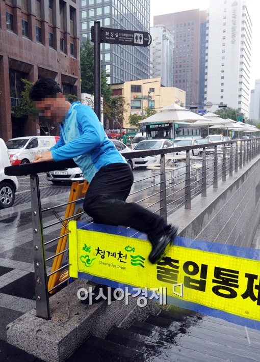 [아시아경제 백소아 인턴 기자]28일 서울 청계천 일대에 많은 비가 쏟아지자 서울시는 침수위험을 방지하기 위해 청계천 출입을 통제하였다. 이에 미쳐 나오지 못한 시민이 급하게 통제라인을 넘고 있다. 백소아 기자 sharp2046@<ⓒ세계를 보는 창 경제를 보는 눈, 아시아경제(www.asiae.co.kr) 무단전재 배포금지>