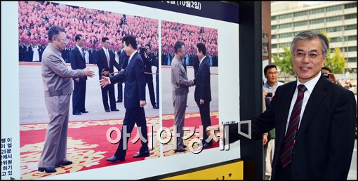 [아시아경제 최우창 기자] 민주통합당 문재인 대통령 후보가 4일 오후 서울 세종문화회관에서 열린 10.4 남북정상선언 5주년 토론회 및 기념식에 참석, 행사 전 관계자들과 함께 기념사진전을 관람하며 즐거워하고 있다.최우창 기자 smicer@<ⓒ세계를 보는 창 경제를 보는 눈, 아시아경제(www.asiae.co.kr) 무단전재 배포금지>