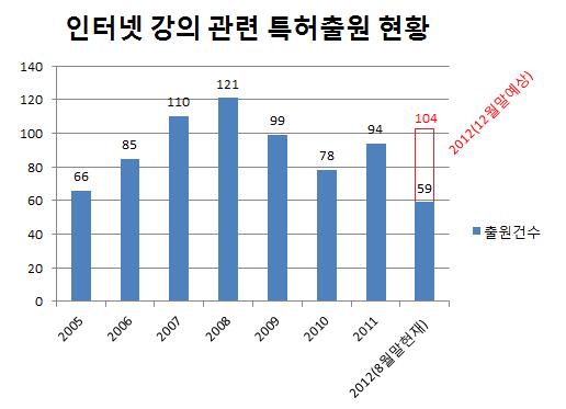 최근 8년(2005~2012년) 사이 인터넷강의 관련 특허출원 건수 비교 그래프