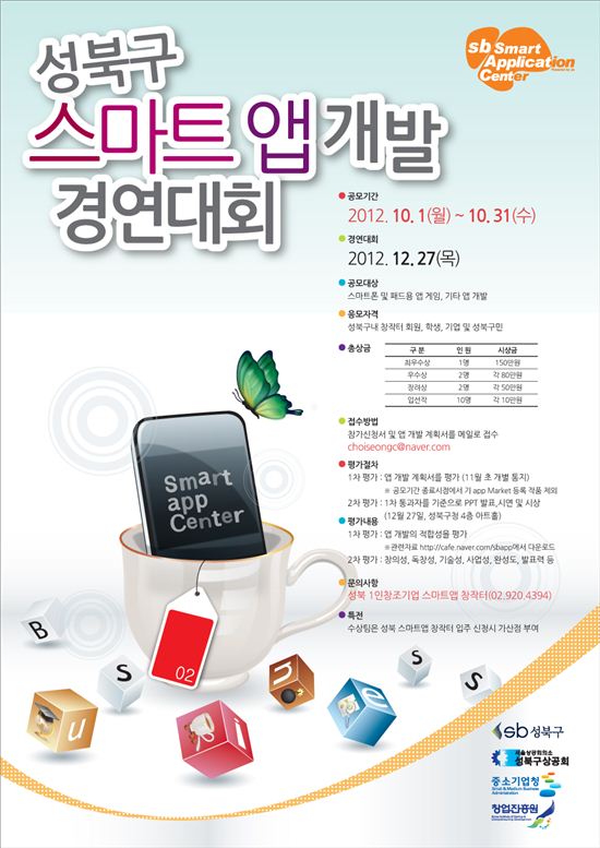 [아시아경제 박종일 기자]성북구(구청장 김영배)가 중소기업청 창업진흥원 성북상공회와 공동으로 개최하는 ‘성북구 스마트 앱 개발 경연대회’ 참가자를 공모한다.이번 경연대회는 지역내 청년과 대학생 창업을 유도, 창조산업 활성화와 일자리 창출에 기여하기 위한 행사로 이달 31일까지 신청을 받는다.신청자격은 성북구민, 성북구 스마트 앱 창작터 회원, 성북구 소재 학교 학생 또는 기업체이면 누구나 가능하며 1명(팀)이 1건만 응모할 수 있다.1차 서면심사를 거쳐 선정된 15개 팀은 오는 12월27일 개최되는 ‘성북구 스마트 앱 개발 경연대회’ 본선에 참가할 수 있게 된다.