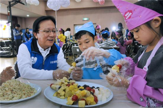 박근희 삼성생명 사장(사진 왼쪽)이 서울 광진구 중곡종합사회복지관을 방문해 공부방 아이들과 함께 요리를 만들고 있다.