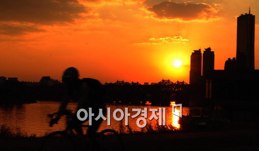 [아시아경제 백소아 인턴 기자] 9일 서울 이촌동 한강시민공원을 찾은 한 시민이 아름다운 노을을 배경으로 자전거를 타고 있다.백소아 인턴 기자 sharp2046@<ⓒ세계를 보는 창 경제를 보는 눈, 아시아경제(www.asiae.co.kr) 무단전재 배포금지>