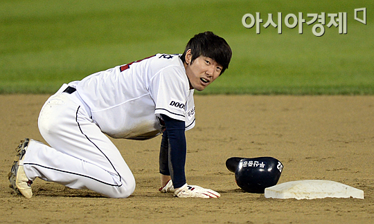 [아시아경제 정재훈 기자] 9일 오후 잠실야구장에서 열린 '2012 팔도 프로야구 준플레이오프 두산 베어스와 롯데 자이언츠의 2차전 경기 5회말 2사 1루 상황에서 폭투를 틈타 도루에 성공했던 김재호가 오버런으로 태그아웃당한 뒤 망연자실한 모습.정재훈 기자 roze@<ⓒ세계를 보는 창 경제를 보는 눈, 아시아경제(www.asiae.co.kr) 무단전재 배포금지>