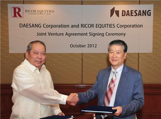 ▲명형섭 대상 대표이사(사진 우측)사장과 Daniel T.Go 리코 에퀴티즈社 대표이사(좌측)가 합작투자 계약서에 서명하고 악수를 나누고 있다<br />