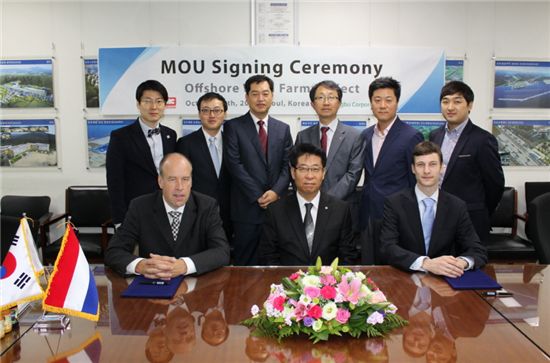 10일 해상풍력발전사업에 관한 MOU 체결식에 참여한 (아래 좌측부터)IHC 핸들링시스템즈의 마크두두인(Marc Doorduin), 동부건설의 손석광 기술연구소장, IHC 하이드로해머의바스티앙 스터만(Bastiaan Stuurman) / 동부건설