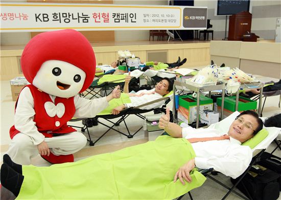 [아시아경제 노미란 기자]KB국민은행은 10일 서울 여의도본점 대강당에서 'KB 희망나눔 헌혈 캠페인'을 실시했다.이날 행사에는 민병덕 KB국민은행장과 박병권 노조 위원장이 헌혈에 직접 참여해 헌혈증서를 기부하고 헌혈에 동참한 임직원들을 격려했다. KB국민은행은 12일까지 여의도본점, 서여의도본점, 명동본점에서 본점 직원들을 대상으로, 20일까지는 영업점 직원들을 대상으로 캠페인을 진행할 계획이다.기부받은 헌혈증서는 소아암, 백혈병 등으로 투병중인 소외계층 아동들에게 전달될 예정이다.민 행장은 "헌혈은 사람의 생명을 살릴 수 있는 고귀한 사랑 나눔"이라며 "KB국민은행 임직원들은 정기적인 헌혈 캠페인을 통해 헌혈 문화 확산에 힘을 보태겠다"고 말했다.노미란 기자 asiaroh@<ⓒ세계를 보는 창 경제를 보는 눈, 아시아경제(www.asiae.co.kr) 무단전재 배포금지>