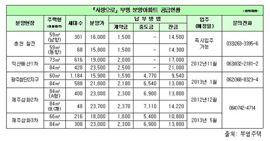 [아시아경제 이민찬 기자]부영주택이 전국 7개 지역에서 1만여가구를 쏟아낸다. 취득·양도소득세 감면과 금리 인하로 부동산 시장이 서서히 활기를 찾는 상황이어서 어떤 성적표를 받아들지 관심이 모아진다. 주택공급지역은 평택, 진천, 춘천, 광주, 익산, 제주, 경산 등이다.이들 단지는 도시계획에 의해 조성된 택지개발지구 내에 위치해 기반시설이 뛰어나고 교통, 교육, 편의시설 등도 잘 갖춰져 있다. 특히 주택시장이 전반적인 침체기에도 꾸준히 인기를 얻고 있는 중·소형 평형 위주이며 대규모 단지로 조성됐다. 임대의 경우 확정분양가 방식으로 공급하고 있어 5년 후 시세차익도 얻을 수 있다. 선착순 동·호수 지정계약이 가능하다. ◆평택 청북 '사랑으로' 부영 1~5차 = 지하 1층, 지상 13~20층 49개 동, 59~84㎡ 3310가구로 구성돼 있는 대단지 아파트다. 인근에 43만9000㎡ 규모의 퍼블릭골프장이 들어설 예정이다. 단지 옆 산책길과 소나무 숲 조성으로 녹지율 42%의 쾌적한 환경을 자랑한다. 고덕국제신도시 내 삼성고덕산업단지 조성, 미군기지 이전이 예정돼 있어 미래가치가 뛰어나다. 또 택지 내에 개교한 청옥초교를 비롯해 중학교가 추가로 개교 예정이다. 인근 홈플러스, 로데오프라자가 있어 교육·생활환경도 우수하다. 청북IC와 서평택 IC, 어연IC 등 고속도로가 인접한 특급 교통망을 갖추고 있다. 평택항 개발, 포승국가산업단지 등의 배후수요도 풍부하다. 분양가는 3.3㎡당 580만~650만원(기준층 기준) 선이다.◆진천 장관 '사랑으로' 부영 1·2차 = 지하 1층, 지상 15~20층 15개동, 전용면적 59㎡ 918가구, 84㎡ 346가구 등 총 1264가구로 구성돼 있다. 1차는 내년 1월, 2차는 오는 12월 입주 예정이다. 중부고속도로 진천IC, 동서고속도로 북진천IC에 인접해 자동차로 서울까지 1시간, 혁신도시 20분, 청주공항 20분이 소요되는 등 중부내륙, 동서부지역 이동이 가능한 사통팔달의 교통여건을 자랑한다. 진천읍에 위치한 삼수초, 진천고, 진천상고 등 인근에 교육시설들이 위치해 있다. 우석대 제2캠퍼스도 조성될 예정이다. 진천 시내와 5분거리에 위치해 진천군청, 법원 등 관공서는 물론 병원, 보건소, 시외버스터미널과 편의시설을 편리하게 누릴 수 있다. 분양가는 59㎡ 1억4400만원, 84㎡ 2억400만원(기준층 기준)이다.◆춘천 칠전 '사랑으로' 부영 = 강원도 춘천시 칠전동에 위치한 '사랑으로' 부영은 지하 2층, 지상 13~18층 5개동 규모에 전용면적 59㎡ 369가구로 구성돼 있으며 즉시 입주가 가능하다.단지 옆 신남초등학교, 남춘천중, 남춘천여중, 강원체육고교(예정), 강원대, 춘천교육대, 한림대 등이 인접해 있다. 라데나 골프장, 송암 스포츠타운 등이 인근에 있다. 이마트, 롯데마트 등 대형마트와 은행, 병원 등의 생활 인프라 시설도 잘 갖춰져 있다.연간 1000만명 가까운 관광객이 찾는 문화예술도시 춘천은 경춘선 복선전철 개통 등의 각종 호재가 잇따르고 있는 지역이다. 중앙고속도로, 서울-춘천간 고속도로와 준 고속전철 ITX청춘열차 개통으로 남춘천역에서 서울까지 1시간이면 이동 가능하다. 분양가격은 기준층 기준으로 남향이 1억6000만원, 동향이 1억5800만원이다. ◆익산 배산 '사랑으로' 부영 1차 = 지하 1층, 지상 15~23층 12개동 규모에 전용면적 73㎡ 616가구, 84㎡ 428가구 등 총 1044가구로 구성돼 있다. 오는 11월이면 입주가 가능하다. 익산시 서남부 지역에 속한 배산택지개발지구는 인근 KTX익산역 복합환승센터 조성 호재와 함께 신주거중심지로 주목받고 있는 지역이다. 국가 식품클러스터, 종합의료과학 산업단지, 익산일반산업단지 등의 개발에 대한 수혜지로서의 가치가 높다.인근 익산시립 모현도서관과 함께 영만초, 모현초, 이리북중, 이리고, 원광여중·고, 남성중·고 등의 우수학군과 배산지구내 개교예정인 초등학교 2개와 원광대학교와 전북대학교 익산캠퍼스 등도 가까워 교육여건이 뛰어나다. 익산시청, 경찰서, 우체국 등 주요 관공서와 대학병원, 대형마트 등 편의시설이 인근에 위치하며 단지 앞 대규모 공원과 근처의 배산체육공원, 익산배산공원 등 우수한 생활 인프라를 자랑한다. 23번, 27번 국도로 전주, 군산, 김제 등 인근 주요도시까지 30분 내로 진입할 수 있다. KTX 익산역과 고속버스터미널을 통해 수도권 등으로 이동이 용이하다. 서해안고속도로, 호남고속도로 등 광역교통망도 갖추고 있다. 분양가격은 기준층 기준으로 발코니 확장비용을 포함해 73㎡ 1억9000만원, 84㎡ 2억3500만원이다.◆제주 삼화 '사랑으로' 부영 1·2·3차 = 324가구가 공공임대로 분양되는 '사랑으로' 부영 1차는 지상12층, 8개동에 전용면적 73~84㎡ 주택형이 들어선다. 일반분양인 2차·3차는 지상 12층, 23개동, 66~84㎡ 972가구가 공급된다.제주공항과 제주시청에서 약5~10㎞지점에 위치해 있으며 북쪽으로는 일주도로와 인접해 있고 남쪽으로는 연삼로와 연결돼 있어 구제주와 신제주로의 접근성이 우수한 교통의 요지다. 택지지구 인근에는 총 6개의 초·중·고교, 제주대학교 사라캠퍼스가 있다. 지구내에 초등학교 2개, 중학교 1개가 추가로 신설될 예정이어서 교육여건도 뛰어나다. 인근에 국립제주박물관, 제주시 국민체육센터, 제