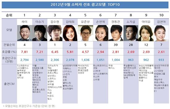 2012년 9월 소비자 선호 광고모델 TOP20 모델 [자료: 한국CM전략연구소]