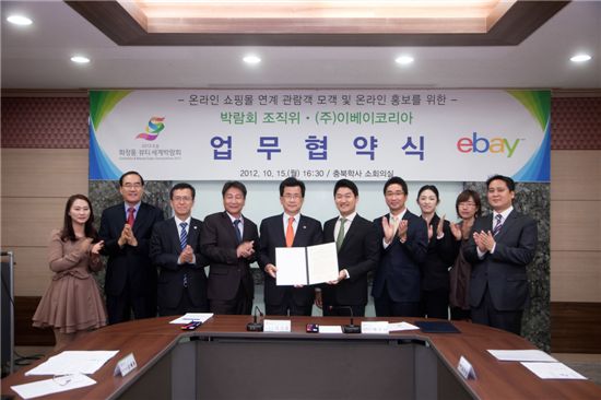 이베이코리아와 충북뷰티세계박람회 위원회는 15일 ‘2013 오송화장품?뷰티세계박람회’의 성공적인 개최 및 온라인 홍보를 위한 업무 협약을 체결했다. 충북학사 소회의실에서 진행된 협약식에는 이베이코리아 박주만 대표(우)와 조직위원회 이시종 위원장(좌)이 참석했다. <br /> <br /> <br /> <br />