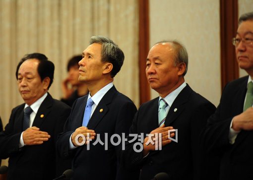 [아시아경제 백소아 인턴 기자] 16일 서울 세종 정부청사에서 열린 국무회의에 참석한 김관진 국방부 장관이 침울한 표정으로 국기에 대한 경례를 하고 있다.백소아 인턴 기자 sharp2046@<ⓒ세계를 보는 창 경제를 보는 눈, 아시아경제(www.asiae.co.kr) 무단전재 배포금지>