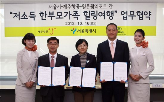 [아시아경제 황준호 기자] 제주항공이 한부모가족을 대상으로 괌 여행을 지원한다. 애경그룹 계열의 제주항공은 서울시, 힐튼괌리조트 등과 함께 지난 16일 오후 서울시청 신청사에서 한부모가족 사회공헌 프로그램을 공동 진행하는 내용의 업무협약을 체결했다.이날 협약식에서는 조현옥 서울시 여성가족정책실장, 엄부영 제주항공 상무(COO 겸 영업본부장), 김진구 PHR코리아(힐튼괌리조트 한국 마케팅 총괄 운영업체) 대표가 업무협약서에 서명했다.'서울시-제주항공, 한부모가족 3대 괌힐튼 힐링여행'으로 명명된 이번 사회공헌사업은 서울시, 힐튼괌리조트 등과 함께 저소득 한부모 가족의 3대를 함께 3박4일 여정으로 괌 여행을 보내주는 것을 골자로 한다. 제주항공은 이번 업무협약을 통해 매 짝수달에 괌 왕복 5인 항공권을 지원한다.3대가 함께 괌 무료해외여행을 가길 원하는 한부모가족은 서울특별시 한부모가족지원센터 홈페이지나 우편, 직접방문으로 신청이 가능하다. 선정결과는 한부모가족지원센터 홈페이지 발표 및 개별 통보한다. 제주항공은 지난 9월27일 인천~괌 노선 신규취항을 기념해 이번 사회공헌프로그램에 참여했다. 황준호 기자 rephwang@<ⓒ세계를 보는 창 경제를 보는 눈, 아시아경제(www.asiae.co.kr) 무단전재 배포금지>