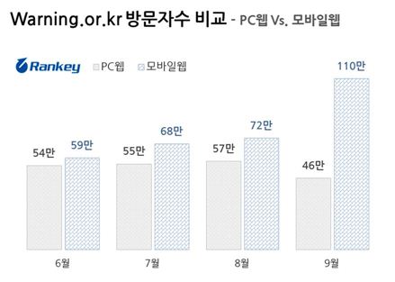[아시아경제 김철현 기자]불법·유해 사이트 접속량이 PC보다 스마트폰에서 2배 이상 많은 것으로 나타났다.17일 시장조사 전문 업체 랭키닷컴에 따르면 불법·유해 사이트 접속 차단 서비스인 워닝(warning.or.kr)의 9월 방문자 수는 모바일에서만 110만 명을 기록했다. 이는 같은 기간 PC 웹사이트에서 발생한 트래픽보다 2배 이상 높게 나타난 것이다. 또한 워닝의 10월 첫째 주 사이트 순위는 PC에서는 439위에 그쳤지만 모바일에서는 36위로 나타났다.워닝은 사이버경찰청과 방송통신심의위원회에서 운영하는 불법·유해 사이트 접속 차단 서비스로 사용자가 각종 불법 콘텐츠를 제공하는 사이트에 접속하려고 할 때 이를 차단하고 경고 메시지를 보여준다. 랭키닷컴은 "워닝의 트래픽이 높다는 것은 그 만큼 불법·유해 사이트의 접속 시도가 많았다는 것을 의미한다"고 설명했다. 한광택 랭키닷컴 대표는 "혼자 보는 매체라는 인식이 강한 스마트폰의 특성이 웹사이트 이용 패턴에 영향을 미친 것으로 보인다"고 분석했다.