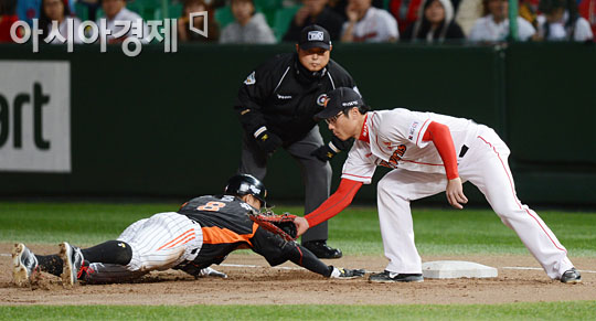 [인천=아시아경제 정재훈 기자] 17일 오후 인천 문학야구장에서 열린 2012 팔도 프로야구 플레이오프 SK 와이번스와 롯데 자이언츠의 2차전 2회초 2사 1루 상황에서 박정권이 견제구를 받아 1루주자 전준우에게 태그를 시도하고 있다.정재훈 기자 roze@<ⓒ세계를 보는 창 경제를 보는 눈, 아시아경제(www.asiae.co.kr) 무단전재 배포금지>