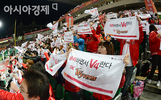 [인천=아시아경제 정재훈 기자] 17일 오후 인천 문학야구장에서 열린 2012 팔도 프로야구 플레이오프 SK 와이번스와 롯데 자이언츠의 2차전에서 SK 팬들이 수건 응원을 펼치고 있다.정재훈 기자 roze@<ⓒ세계를 보는 창 경제를 보는 눈, 아시아경제(www.asiae.co.kr) 무단전재 배포금지>