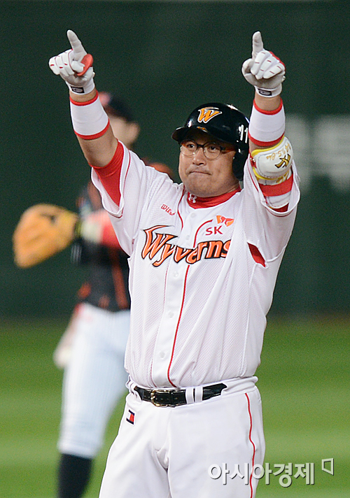 [인천=아시아경제 정재훈 기자] 17일 오후 인천 문학야구장에서 열린 2012 팔도 프로야구 플레이오프 SK 와이번스와 롯데 자이언츠의 2차전 6회말 2사 1,2루 상황에서 조인성이 2타점 2루타를 쳐낸 후 기뻐하고 있다.정재훈 기자 roze@<ⓒ세계를 보는 창 경제를 보는 눈, 아시아경제(www.asiae.co.kr) 무단전재 배포금지>