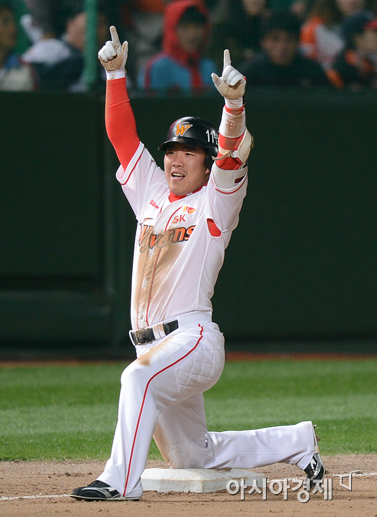 [인천=아시아경제 정재훈 기자] 17일 오후 인천 문학야구장에서 열린 2012 팔도 프로야구 플레이오프 SK 와이번스와 롯데 자이언츠의 2차전 7회말 선두타자 정근우가 3루타를 친 후 기뻐하고 있다.정재훈 기자 roze@<ⓒ세계를 보는 창 경제를 보는 눈, 아시아경제(www.asiae.co.kr) 무단전재 배포금지>