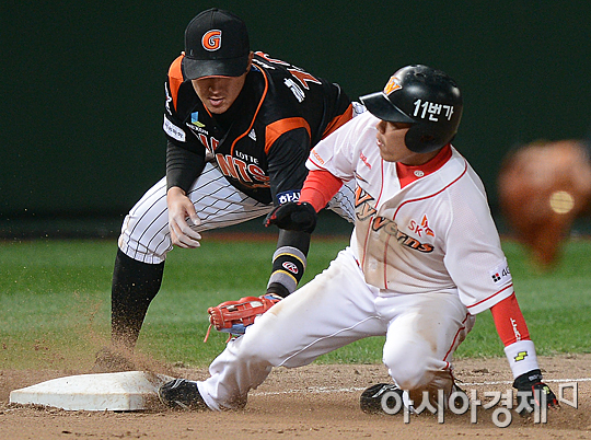 [인천=아시아경제 정재훈 기자] 17일 오후 인천 문학야구장에서 열린 2012 팔도 프로야구 플레이오프 SK 와이번스와 롯데 자이언츠의 2차전 9회말 1사 1,2루 상황에서 최정이 삼진아웃되는 틈을 타 3루 도루에 성공하는 정근우.정재훈 기자 roze@<ⓒ세계를 보는 창 경제를 보는 눈, 아시아경제(www.asiae.co.kr) 무단전재 배포금지>