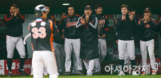 [인천=아시아경제 정재훈 기자] 17일 오후 인천 문학야구장에서 열린 2012 팔도 프로야구 플레이오프 SK 와이번스와 롯데 자이언츠의 2차전 10회초 2사 만루 상황에서 정훈이 볼넷을 얻어내며 득점을 올리자 롯데 선수들이 기뻐하고 있다.정재훈 기자 roze@<ⓒ세계를 보는 창 경제를 보는 눈, 아시아경제(www.asiae.co.kr) 무단전재 배포금지>