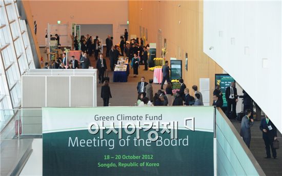 18일 유엔 녹색기후기금(GCF) 제 2차 이사회가 개막한 인천 송도컨벤시아 2층 대회의장 로비에 이사국 참가단들이 이사회를 기다리고 있다. /사진제공 = 인천시