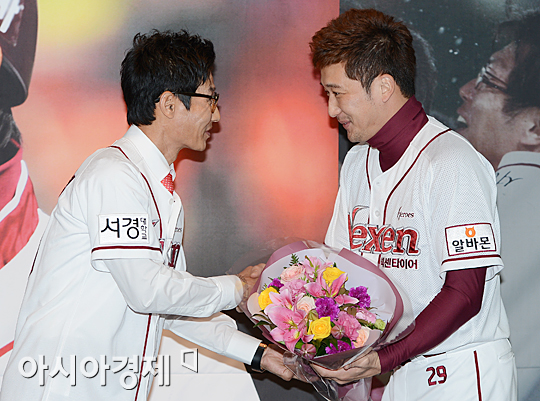 [아시아경제 정재훈 기자] 염경엽 넥센 히어로즈 신임 감독이 18일 오후 서울 목동야구장에서 취임식을 가졌다. 이택근이 염경엽 감독에게 꽃다발을 전달하고 있다.정재훈 기자 roze@<ⓒ세계를 보는 창 경제를 보는 눈, 아시아경제(www.asiae.co.kr) 무단전재 배포금지>