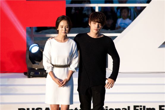 Actress Song Ji-hyo (left) and singer-actor Kim Jae-joong pose together at the 17th Busan International Film Festival's Outdoor Stage in Haeundae BIFF village in Busan, South Korea, on October 5, 2012. [Lee Jin-hyuk/ 10Asia]