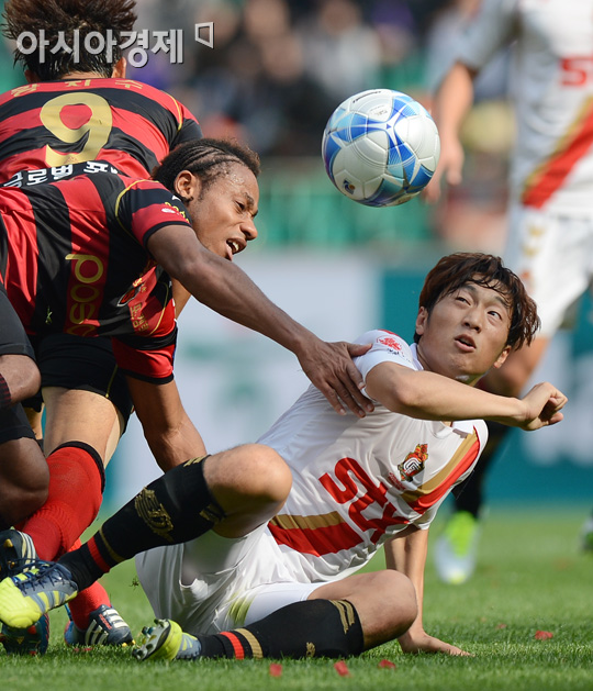 [포항=아시아경제 정재훈 기자] 20일 오후 포항 스틸야드에서 열린 2012 하나은행 FA컵 결승전 포항스틸러스와 경남FC의 경기에서 아사모아가 최영준을 손으로 누르며 일어나지 못하게 하고 있다.정재훈 기자 roze@<ⓒ세계를 보는 창 경제를 보는 눈, 아시아경제(www.asiae.co.kr) 무단전재 배포금지>