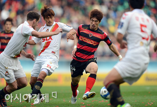 [포항=아시아경제 정재훈 기자] 20일 오후 포항 스틸야드에서 열린 2012 하나은행 FA컵 결승전 포항스틸러스와 경남FC의 경기에서 김대호가 공을 드리블하며 경남 진영을 누비고 있다.정재훈 기자 roze@<ⓒ세계를 보는 창 경제를 보는 눈, 아시아경제(www.asiae.co.kr) 무단전재 배포금지>