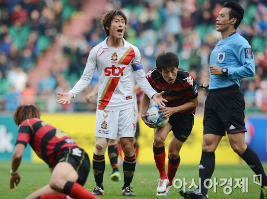 [포항=아시아경제 정재훈 기자] 20일 오후 포항 스틸야드에서 열린 2012 하나은행 FA컵 결승전 포항스틸러스와 경남FC의 경기에서 정다훤이 파울 선언에 항의하고 있다.정재훈 기자 roze@<ⓒ세계를 보는 창 경제를 보는 눈, 아시아경제(www.asiae.co.kr) 무단전재 배포금지>