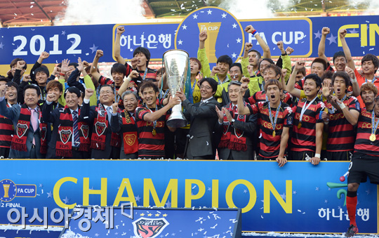 [포항=아시아경제 정재훈 기자] 포항 스틸러스가 20일 오후 포항 스틸야드에서 열린 2012 하나은행 FA컵 결승전에서 연장 후반 박성호의 결승골로 1:0으로 경남FC를 누르고 우승 트로피를 차지했다.정재훈 기자 roze@<ⓒ세계를 보는 창 경제를 보는 눈, 아시아경제(www.asiae.co.kr) 무단전재 배포금지>