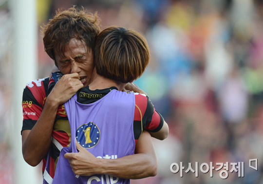 [포항=아시아경제 정재훈 기자] 포항 스틸러스가 20일 오후 포항 스틸야드에서 열린 2012 하나은행 FA컵 결승전에서 연장 후반 박성호의 결승골로 1:0으로 경남FC를 누르고 우승 트로피를 차지했다. 결승골을 터뜨린 박성호가 노병준과 포옹을 나누고 있다.정재훈 기자 roze@<ⓒ세계를 보는 창 경제를 보는 눈, 아시아경제(www.asiae.co.kr) 무단전재 배포금지>