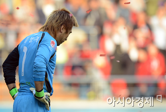 [포항=아시아경제 정재훈 기자] 포항 스틸러스가 20일 오후 포항 스틸야드에서 열린 2012 하나은행 FA컵 결승전에서 연장 후반 박성호의 결승골로 1:0으로 경남FC를 누르고 우승 트로피를 차지했다. 패배에 고개를 떨구는 김병지.정재훈 기자 roze@<ⓒ세계를 보는 창 경제를 보는 눈, 아시아경제(www.asiae.co.kr) 무단전재 배포금지>