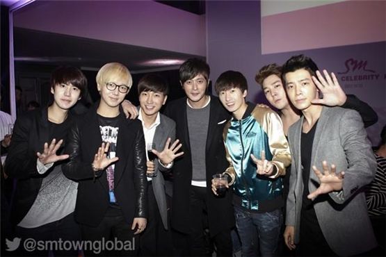 Super Junior's Kyuhyun (left), Yesung (second to left), Lee Teuk (third to left), Eunhyuk (third to right), Kangin (second to right), Donghae (right) and actor Jang Dong-gun (center) pose together during "SMTOWN Celebrity Party" held in Seoul, on October 23, 2012. [SM's official Twitter account]