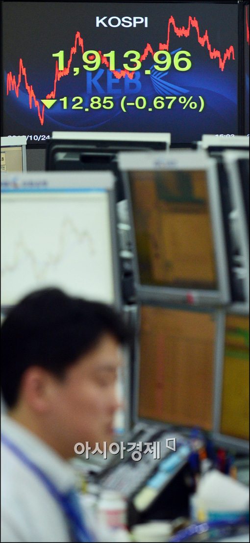[아시아경제 최우창 기자] 24일 코스피가 12.85(0.67%) 내린 1,913.96에 장을 마감한 가운데 이날 서울 중구 외환은행 딜링룸에서 직원들이 업무를 보고 있다.최우창 기자 smicer@<ⓒ세계를 보는 창 경제를 보는 눈, 아시아경제(www.asiae.co.kr) 무단전재 배포금지>