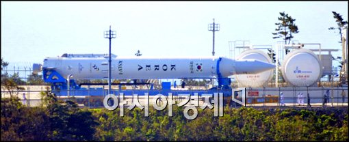 [아시아경제]한국 최초의 우주발사체인 나로호의 마지막 3차 발사를 이틀 앞둔 24일 오전 나로호가 우주센터 조립동에서 나와 발사대로 이동하고 있다. <사진공동취재단> 최우창 기자 smicer@<ⓒ세계를 보는 창 경제를 보는 눈, 아시아경제(www.asiae.co.kr) 무단전재 배포금지>