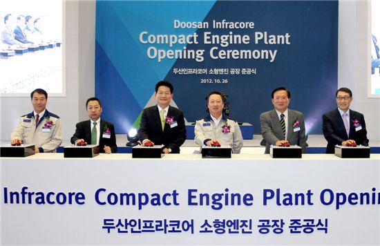 ▲두산인프라코어는 26일 인천 화수동 자사 공장 부지 내에 소형 디젤엔진공장을 준공했다. 이날 준공식에는 (왼쪽부터) 김용성 두산인프라코어 총괄사장, 박정원 ㈜두산 지주부문 회장, 송영길 인천시장, 박용만 두산그룹 회장, 박상은 국회의원, 이현순 두산인프라코어 자문 등이 참석했다.<br />