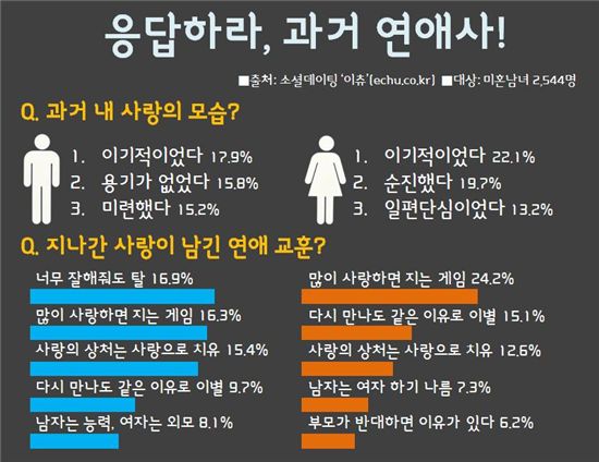 ‘과거 연애사 속의 내 모습’을 스스로 평가하라는 질문에는 남녀 모두 ‘이기적이었다’(남 17.9%, 여 22.1%)는 항목을 첫손에 꼽으며 반성하는 내색을 보였다.이어 남성은 ▲용기가 없었다(15.8%), ▲미련했다(15.2%)는 반응을 보이며 서툰 연애 방식에 안타까움을 표현했고 여성은 ▲순진했다(19.7%), ▲일편단심이었다(13.2%)며 자신의 모습을 회상했다.‘가장 후회되는 연애 사건’을 묻는 질문에는 남녀가 미세한 차이를 드러냈다. 남성은 ‘한 번만 참을 걸’(23.6%)이라며 더 양보하지 못한 과거를 가장 후회했다. 또한 ▲처음부터 만나지 말걸(18.5%), ▲헤어지자고 말하지 말걸(15.3%) 등의 답변을 내놓으며 이루지 못한 사랑을 아쉬워했다.여성의 후회 역시 크게 다르지 않았다. 다만 ‘처음부터 만나지 말걸'(31.4%)이라고 후회하는 응답자가 가장 많아 연애의 시작 자체를 부정하는 모습이었다. 이어 남성과 마찬가지로 ▲한 번만 참을 걸(17.7%), ▲헤어지자고 말하지 말걸(17.1%) 등의 반응이 이어졌다.그러나 과거의 사랑은 후회뿐 아니라 연애에 대한 가르침을 남기고 있었다. 남성은 ‘지나간 사랑이 남긴 연애 교훈’으로 ‘너무 잘해줘도 탈’(16.9%)을 꼽았다. 헌신하면 헌신짝처럼 버려진다는 속설이 그저 우스갯소리만은 아니라는 씁쓸한 반응이었다. 이어 ▲연애는 많이 사랑하는 사람이 지는 게임(16.3%), ▲사랑의 상처는 사랑으로 치유하는 것(15.4%), ▲다시 만나도 같은 이유로 헤어진다(9.7%), ▲남자는 능력, 여자는 외모(8.1%) 등을 들었다.여성은 ‘연애는 많이 사랑하는 사람이 지는 게임’(24.2%)이라는 말에 가장 크게 공감했다. 기타 의견으로는 ▲다시 만나도 같은 이유로 헤어진다(15.1%), ▲사랑의 상처는 사랑으로 치유하는 것(12.6%), ▲남자는 여자 하기 나름(7.3%), ▲부모가 반대하면 이유가 있다(6.2%) 등이 있었다.그렇다면 과거 연애사 중 ‘가장 기억에 남는 이성’은 누구일까. 남성은 1위로 ‘첫사랑’(26.3%)을 선택해 남자의 첫사랑은 무덤까지 간다는 말을 입증했다. 2위는 ‘나에게 헌신적이었던 사람’(21.5%), 3위는 ‘마지막 사랑’(14.6%)으로 집계됐다.여성의 기억에 오래 남는 이성 1위는 ‘나에게 헌신적이었던 사람’(30.7%)이었다. 2위는 여성이 첫사랑을 중시하지 않을 거라는 예상과 다르게 ‘첫사랑’(19.7%)이 차지했다. 이어서 ‘내가 헌신적으로 대했던 사람’(12.9%)이 3위에 올랐다.오미경 이츄 팀장은 “미혼남녀들은 과거 자신의 연애 태도가 이기적이었다고 반성하면서도 막상 상대를 더 많이 좋아하고 잘해주는 것에는 냉소적이다”라며 “지난 사랑을 통해 느꼈던 후회나 교훈을 앞으로의 연애에 밑거름 삼아야 할 것”이라고 덧붙였다.오주연 기자 moon170@<ⓒ세계를 보는 창 경제를 보는 눈, 아시아경제(www.asiae.co.kr) 무단전재 배포금지>