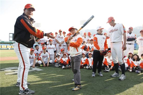 지난 26일 한화이글스 대전 한밭구장에서 한화이글스 前 2군 정영기 감독(왼쪽에서 첫번째)이 중앙지역아동센타 아동에게 타격 자세를 지도하고 있는 모습.