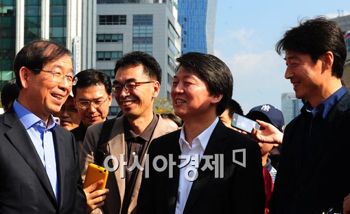 [아시아경제 백소아 기자] 무소속 안철수 대선 후보가 28일 서울 중구 서울광장에서 열린 '2012 서울 북페스티벌'에 참석해 박원순 서울시장과 인사를 나누고 있다.백소아 인턴 기자 sharp2046@<ⓒ세계를 보는 창 경제를 보는 눈, 아시아경제(www.asiae.co.kr) 무단전재 배포금지>