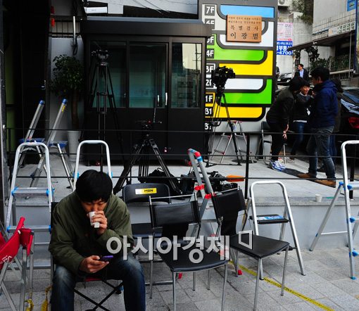 [아시아경제 백소아 인턴 기자] 이명박 대통령의 큰 형 이상은씨의 내곡동 특검 소환을 이틀 앞둔 29일 서울 서초구에 위치한 특검사무실에서 취재진들이 대기하고 있다.백소아 인턴 기자 sharp2046@<ⓒ세계를 보는 창 경제를 보는 눈, 아시아경제(www.asiae.co.kr) 무단전재 배포금지>
